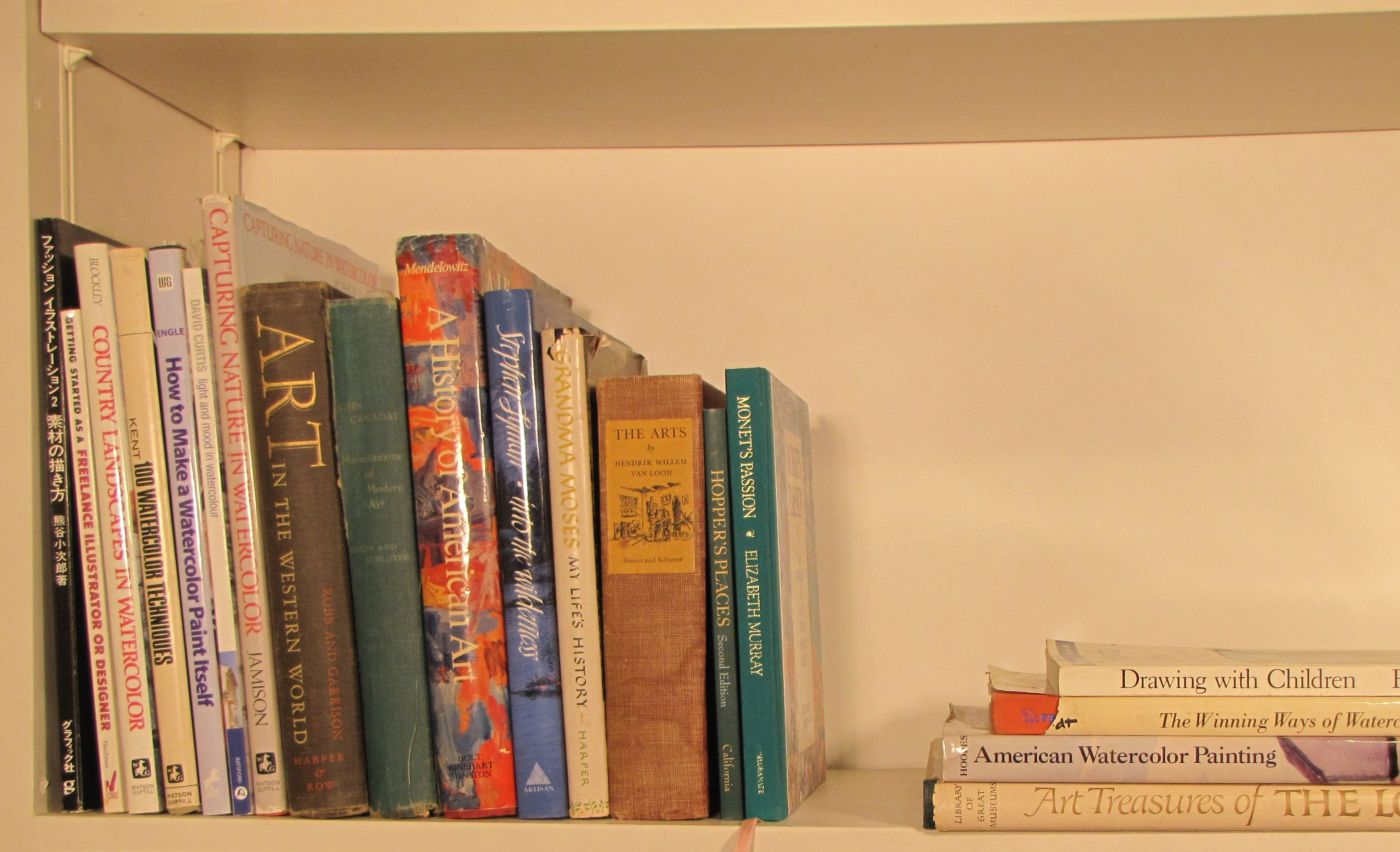 A simple way to practice this idea is to draw a bookshelf. Start with the shelf itself, then the first book and the next and the next. With each new book you can look to see how high it is in relation to the previous book. Is it wider or narrower? Is it pressed up close or at an angle? Just draw what you see. Here, I’ll show you – take a look at this shelf of art books –
