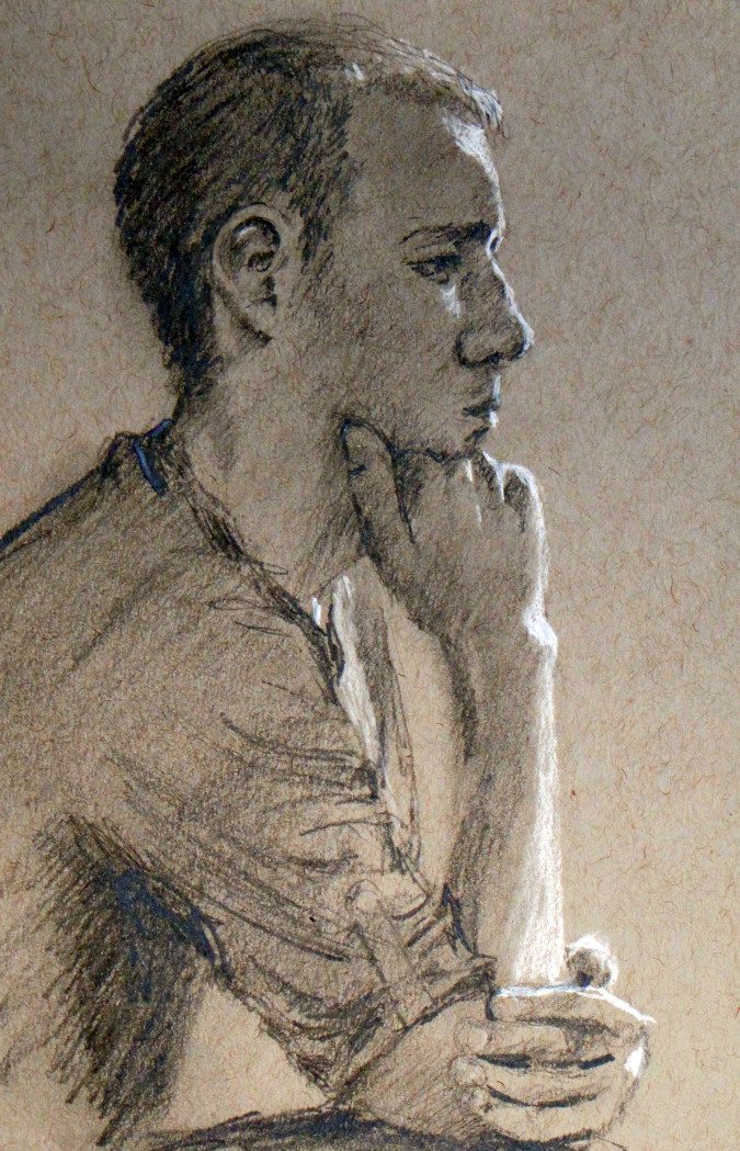 There is one subject I really enjoy using pencil for – portraits. Right now I’m thoroughly enjoying my new toned paper sketchbook. Using a white charcoal pencil for highlights, and a range of graphite for the darker values, faces come to life on the gray paper.