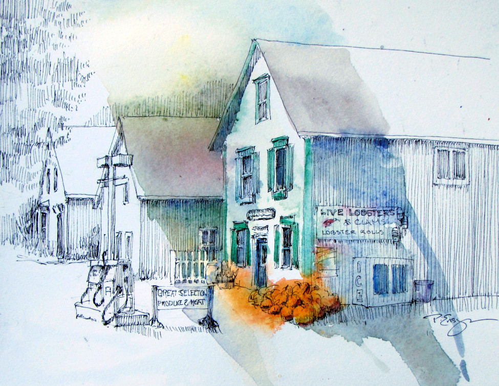 This is a drawing of the town market, gas station, general store and restaurant in Friendship, Maine. The sign said, “Any pumpkin, any size, $5.” I love the simplicity of life Downeast.