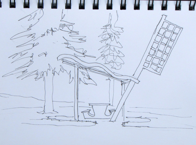 Continuing my journey across Iowa, I took a short detour to the town of Adel. On a tip from my Iowa friend, Jennifer, my destination was the Dallas County Courthouse. This grand building graces a square block in the small town of Adel, population 3,700. Built in 1902, the architecture was inspired by French chateaus with turrets and towers. In the center of town surrounding the courthouse, storefronts are well-preserved from the early 20th century and the roads are paved with red brick. I would have liked to draw the entire building, but just this section was a challenge in itself. I could easily have spent the day drawing various views of the town, but miles are calling and I need to make progress toward home..