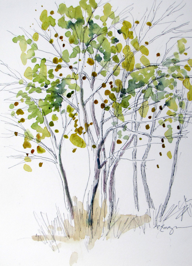 Wyoming is well known for Yellowstone and Grand Teton National Parks, areas of extraordinary beauty.  Much of the rest of the state is barren with low hills, little vegetation and not much else.  I believe there is beauty in everything and if I were to stay there longer I’m sure I would draw and paint the simplicity of the landscape.  There is a peace and purity to it.   I opted for something familiar when I arrived at my campground for the night – lovely young aspens just starting to turn yellow.