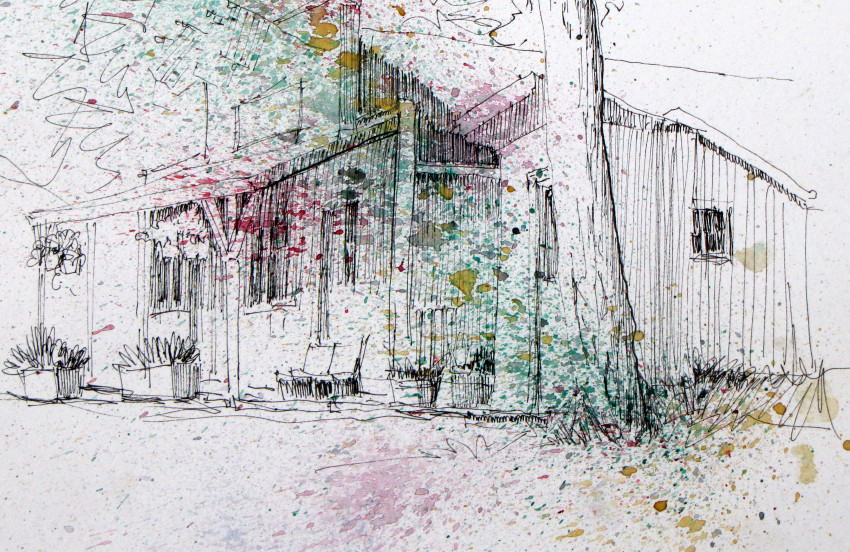 There are so many ways to enhance a drawing with color – watercolor, pastels, gouache, colored pencils, even crayons. Each medium comes with its own characteristics and adds uniqueness. I’ve experimented a little colored pencils and crayon, but because I’ve been using watercolor for some time, I have confidence in it. Plus, I’ve come to enjoy the contrast of the fluid water media against the tight and precise ink lines.
