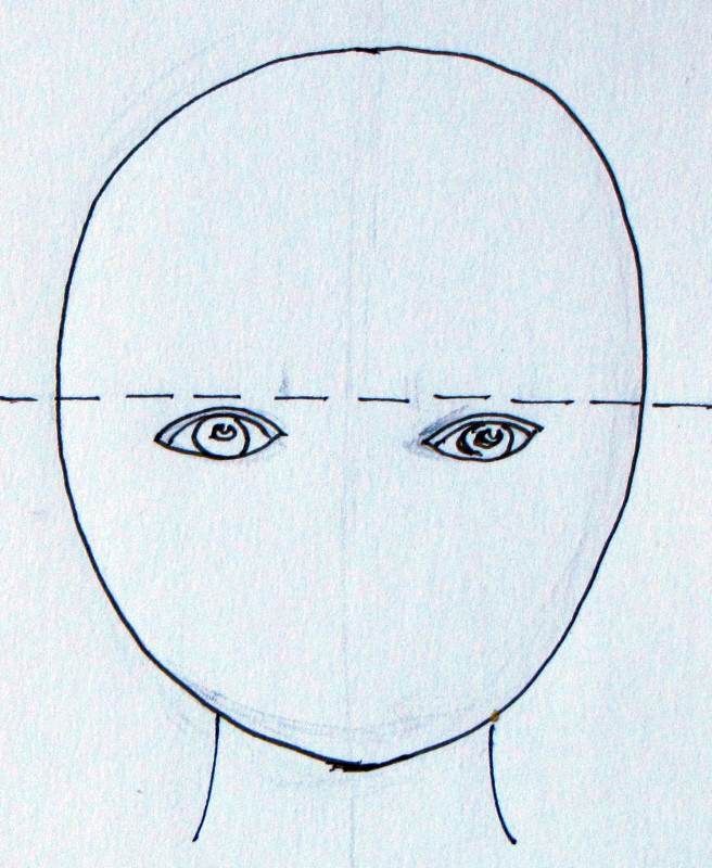 Are the eyes always on the center line? Well no, actually a man’s eyes are generally above the center line, a woman’s usually centered on it, and a child’s are below the line. This does vary somewhat, but I’ve found it to be a good guideline. Without drawing any other feature, the position of the eyes hints at the gender and age of the subject.