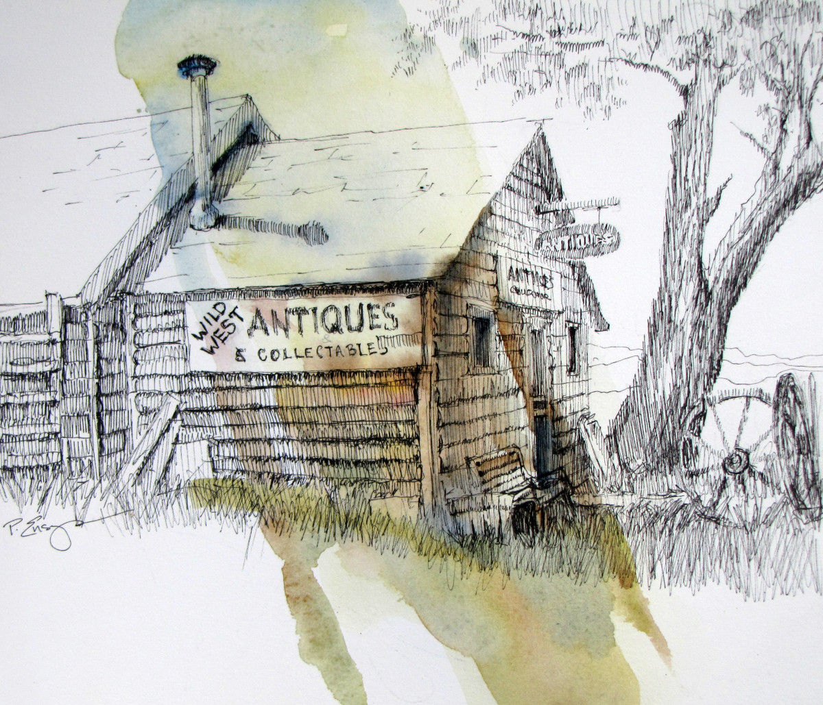 Pretend you’re sitting with me in front of this antique store in Montana. I’ve decided I want to draw the end of the building. I like the sign, the old wagon wheels and the cottonwood tree leaning off to the right. What will help me understand the right proportions of the building? I hold up a pencil in front of the building. Closing one eye, I put the point of the pencil on the left side of the signed section, and my thumb at the right side of that same section.